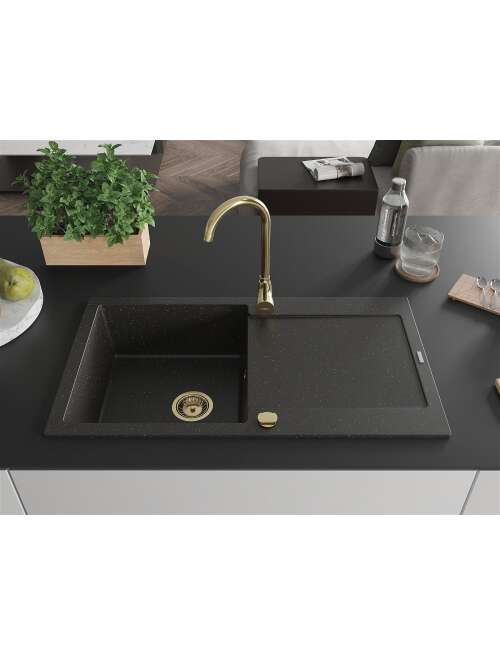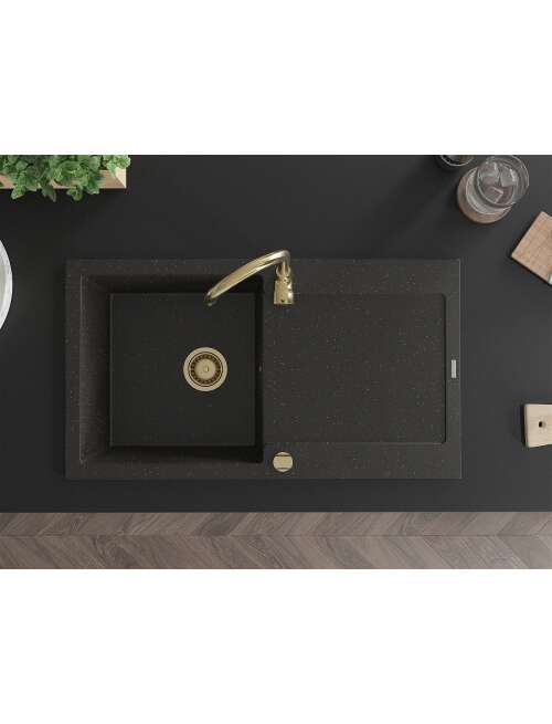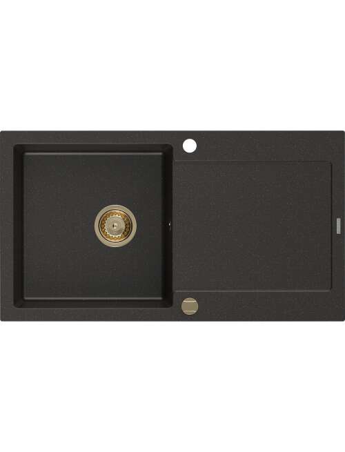 Mexen Leo zlewozmywak granitowy 1-komorowy z ociekaczem 900 x 500 mm, czarny/złoty metalik, syfon złoty - 6501901010-75-G