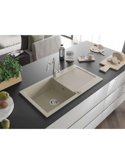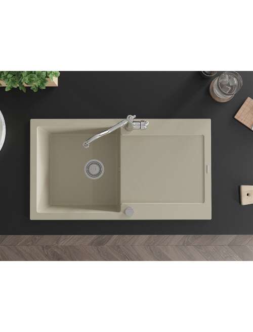 Dane techniczne: Zlewozmywak: Rozmiar: 900x500x190 mm Głębokość komory: 180 mm Wymiary komory: 430x415 mm Średnica odpływu: ø90 mm Typ: 1-komorowy z ociekaczem Rodzaj: Wpuszczany w blat Kolor: Beżowy Wykończenie syfonu: Chrom Materiał: Granit (80% kruszywo granitowe 20% żywice) Otwór przelewowy: Tak Otwory: ( bateria, automat ) 2 Montaż: Uniwersalny, możliwość montażu z ociekaczem po lewej lub prawej stronie Wysoka odporność na zarysowania i przebarwienia Odporność na szok termiczny Powierzchnia ułatwiająca czyszczenie Dwa dodatkowe podfrezowane otwory do samodzielnego wybicia ø35 Bateria kuchenna: Materiał: Mosiądz Kolor: Chrom Głowica: Ceramiczna Perlator: Tak Typ: Jednouchwytowa Wysokość baterii: 290 mm Zasięg wylewki: 260 mm |