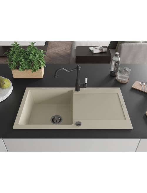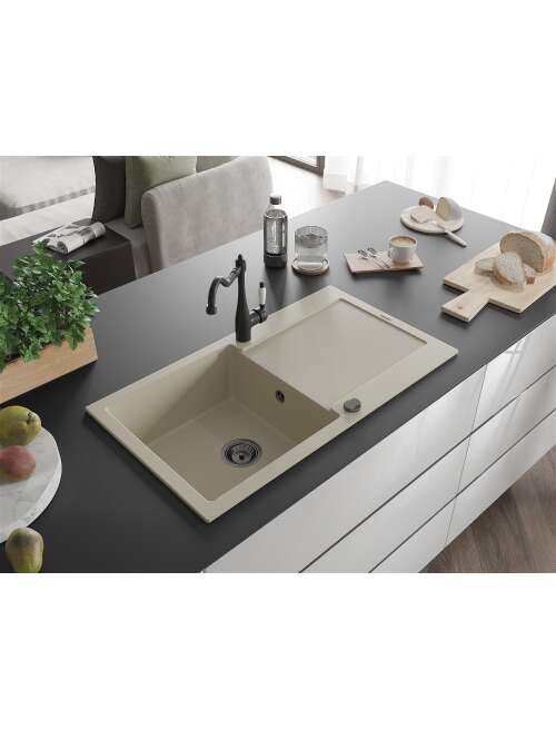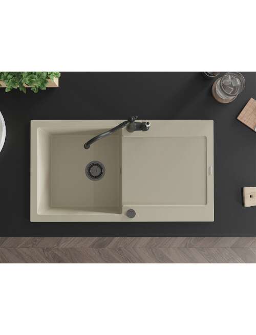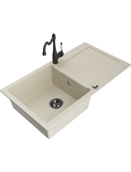 Dane techniczne: Zlewozmywak: Rozmiar: 900x500x190 mm Głębokość komory: 180 mm Wymiary komory: 430x415 mm Średnica odpływu: ø90 mm Typ: 1-komorowy z ociekaczem Rodzaj: Wpuszczany w blat Kolor: Beżowy Wykończenie syfonu: Czarny Materiał: Granit (80% kruszywo granitowe 20% żywice) Otwór przelewowy: Tak Otwory: ( bateria, automat ) 2 Montaż: Uniwersalny, możliwość montażu z ociekaczem po lewej lub prawej stronie Wysoka odporność na zarysowania i przebarwienia Odporność na szok termiczny Powierzchnia ułatwiająca czyszczenie Dwa dodatkowe podfrezowane otwory do samodzielnego wybicia ø35 Bateria kuchenna: Materiał: Mosiądz Kolor: Czarny Głowica: Ceramiczna Perlator: Tak Typ: Jednouchwytowa Wysokość baterii: 290 mm Zasięg wylewki: 260 mm |
