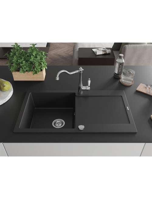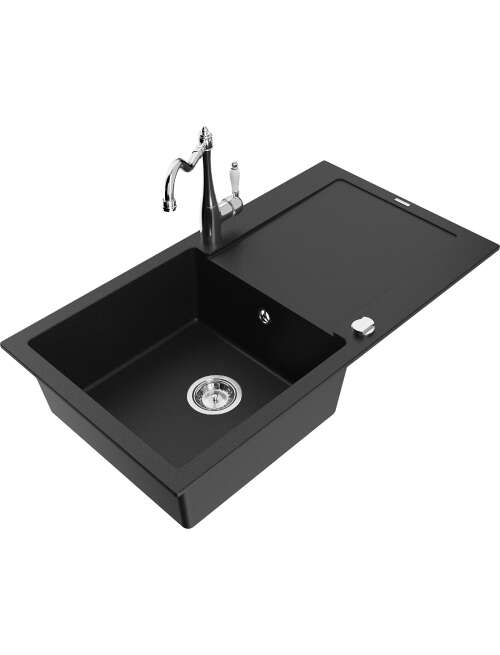 Dane techniczne: Zlewozmywak: Rozmiar: 900x500x190 mm Głębokość komory: 180 mm Wymiary komory: 430x415 mm Średnica odpływu: ø90 mm Typ: 1-komorowy z ociekaczem Rodzaj: Wpuszczany w blat Kolor: Czarny Wykończenie syfonu: Chrom Materiał: Granit (80% kruszywo granitowe 20% żywice) Otwór przelewowy: Tak Otwory: ( bateria, automat ) 2 Montaż: Uniwersalny, możliwość montażu z ociekaczem po lewej lub prawej stronie Wysoka odporność na zarysowania i przebarwienia Odporność na szok termiczny Powierzchnia ułatwiająca czyszczenie Dwa dodatkowe podfrezowane otwory do samodzielnego wybicia ø35 Bateria kuchenna: Materiał: Mosiądz Kolor: Chrom Głowica: Ceramiczna Perlator: Tak Typ: Jednouchwytowa Wysokość baterii: 290 mm Zasięg wylewki: 260 mm |