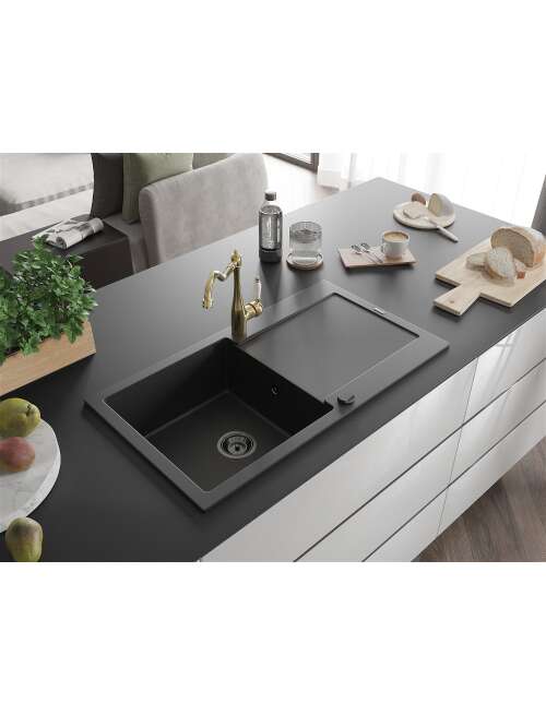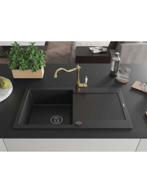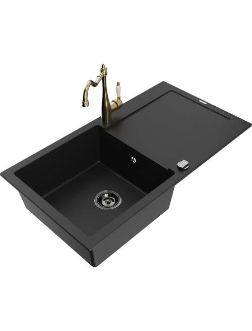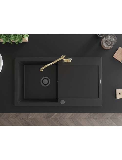 Dane techniczne: Zlewozmywak: Rozmiar: 900x500x190 mm Głębokość komory: 180 mm Wymiary komory: 430x415 mm Średnica odpływu: ø90 mm Typ: 1-komorowy z ociekaczem Rodzaj: Wpuszczany w blat Kolor: Czarny Wykończenie syfonu: Czarny Materiał: Granit (80% kruszywo granitowe 20% żywice) Otwór przelewowy: Tak Otwory: ( bateria, automat ) 2 Montaż: Uniwersalny, możliwość montażu z ociekaczem po lewej lub prawej stronie Wysoka odporność na zarysowania i przebarwienia Odporność na szok termiczny Powierzchnia ułatwiająca czyszczenie Dwa dodatkowe podfrezowane otwory do samodzielnego wybicia ø35 Bateria kuchenna: Materiał: Mosiądz Kolor: Złoty Głowica: Ceramiczna Perlator: Tak Typ: Jednouchwytowa Wysokość baterii: 290 mm Zasięg wylewki: 260 mm |