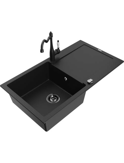 Dane techniczne: Zlewozmywak: Rozmiar: 900x500x190 mm Głębokość komory: 180 mm Wymiary komory: 430x415 mm Średnica odpływu: ø90 mm Typ: 1-komorowy z ociekaczem Rodzaj: Wpuszczany w blat Kolor: Czarny Wykończenie syfonu: Czarny Materiał: Granit (80% kruszywo granitowe 20% żywice) Otwór przelewowy: Tak Otwory: ( bateria, automat ) 2 Montaż: Uniwersalny, możliwość montażu z ociekaczem po lewej lub prawej stronie Wysoka odporność na zarysowania i przebarwienia Odporność na szok termiczny Powierzchnia ułatwiająca czyszczenie Dwa dodatkowe podfrezowane otwory do samodzielnego wybicia ø35 Bateria kuchenna: Materiał: Mosiądz Kolor: Czarny Głowica: Ceramiczna Perlator: Tak Typ: Jednouchwytowa Wysokość baterii: 290 mm Zasięg wylewki: 260 mm |