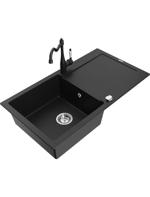 Mexen Leo zlewozmywak granitowy 1-komorowy z ociekaczem i baterią kuchenną Carla, czarny - 6501-77-670700-70