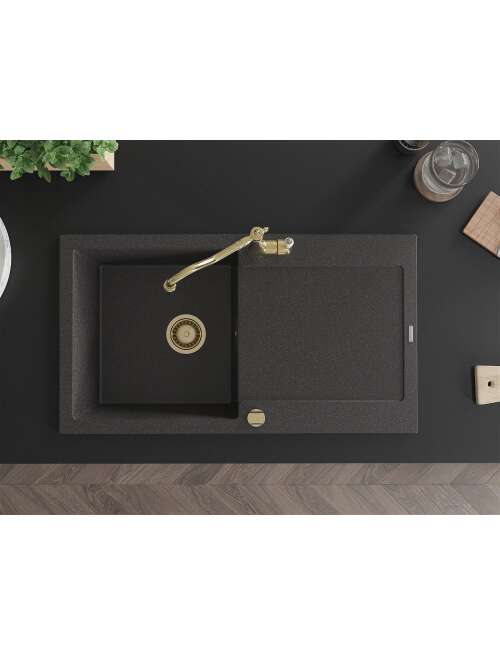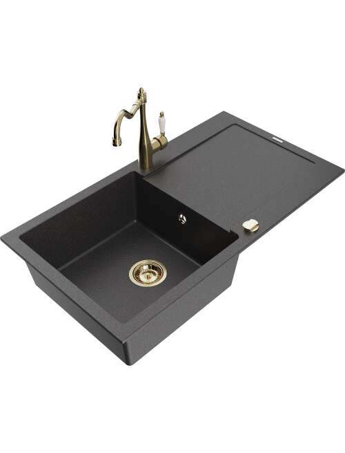 Dane techniczne: Zlewozmywak: Rozmiar: 900x500x190 mm Głębokość komory: 180 mm Wymiary komory: 430x415 mm Średnica odpływu: ø90 mm Typ: 1-komorowy z ociekaczem Rodzaj: Wpuszczany w blat Kolor: Czarny nakrapiany Wykończenie syfonu: Złoty Materiał: Granit (80% kruszywo granitowe 20% żywice) Otwór przelewowy: Tak Otwory: ( bateria, automat ) 2 Montaż: Uniwersalny, możliwość montażu z ociekaczem po lewej lub prawej stronie Wysoka odporność na zarysowania i przebarwienia Odporność na szok termiczny Powierzchnia ułatwiająca czyszczenie Dwa dodatkowe podfrezowane otwory do samodzielnego wybicia ø35 Bateria kuchenna: Materiał: Mosiądz Kolor: Złoty Głowica: Ceramiczna Perlator: Tak Typ: Jednouchwytowa Wysokość baterii: 290 mm Zasięg wylewki: 260 mm |