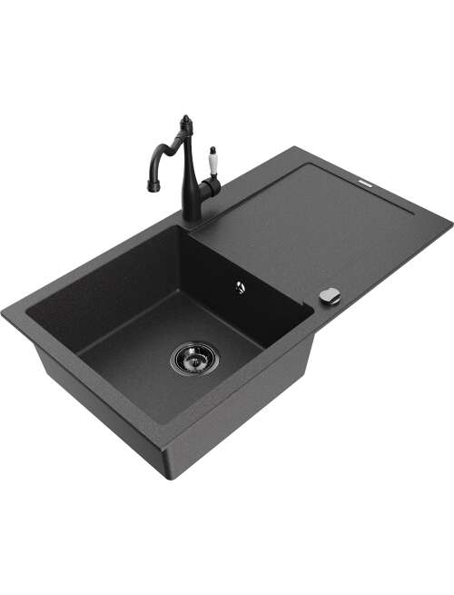 Dane techniczne: Zlewozmywak: Rozmiar: 900x500x190 mm Głębokość komory: 180 mm Wymiary komory: 430x415 mm Średnica odpływu: ø90 mm Typ: 1-komorowy z ociekaczem Rodzaj: Wpuszczany w blat Kolor: Czarny nakrapiany Wykończenie syfonu: Czarny Materiał: Granit (80% kruszywo granitowe 20% żywice) Otwór przelewowy: Tak Otwory: ( bateria, automat ) 2 Montaż: Uniwersalny, możliwość montażu z ociekaczem po lewej lub prawej stronie Wysoka odporność na zarysowania i przebarwienia Odporność na szok termiczny Powierzchnia ułatwiająca czyszczenie Dwa dodatkowe podfrezowane otwory do samodzielnego wybicia ø35 Bateria kuchenna: Materiał: Mosiądz Kolor: Czarny Głowica: Ceramiczna Perlator: Tak Typ: Jednouchwytowa Wysokość baterii: 290 mm Zasięg wylewki: 260 mm |