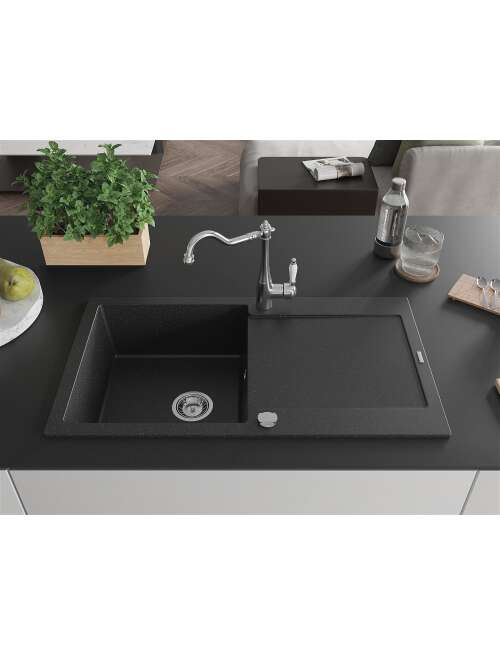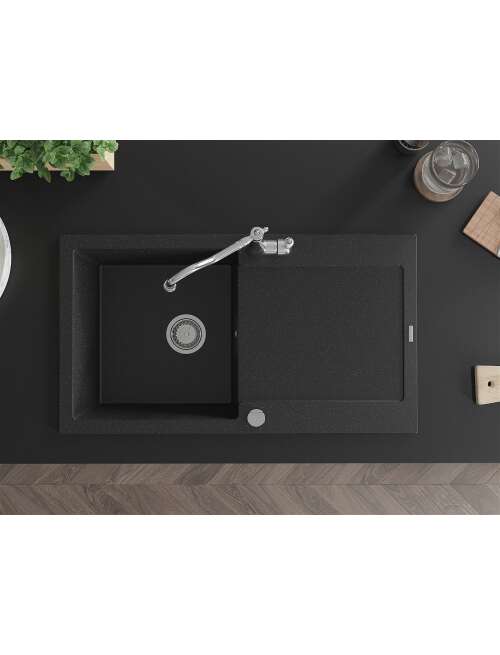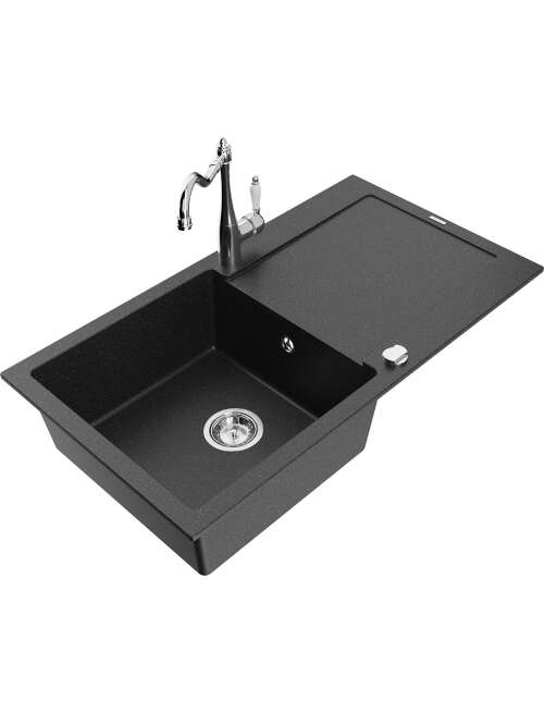 Mexen Leo zlewozmywak granitowy 1-komorowy z ociekaczem i baterią kuchenną Carla, czarny/srebrny metalik - 6501-73-670700-00