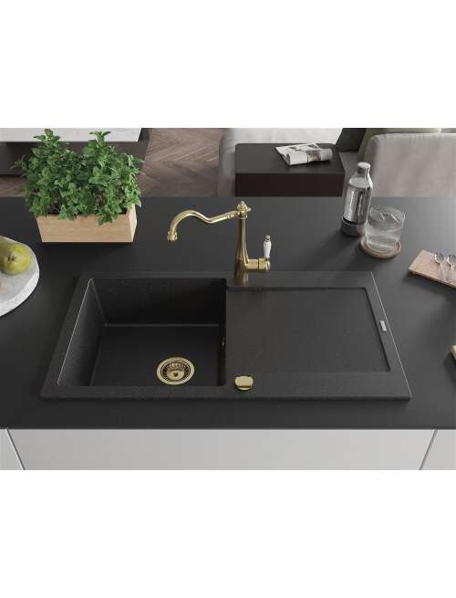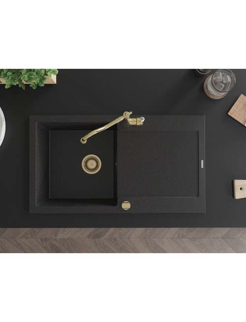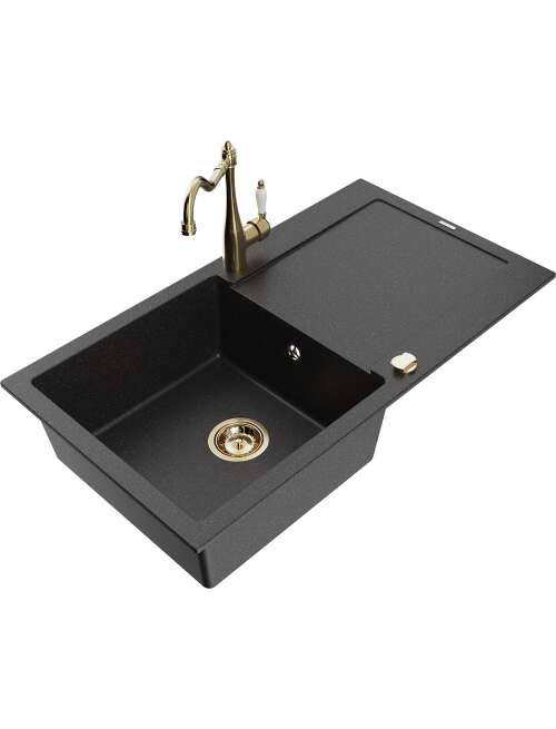 Mexen Leo zlewozmywak granitowy 1-komorowy z ociekaczem i baterią kuchenną Carla, czarny/srebrny metalik - 6501-73-670700-50