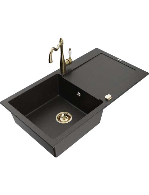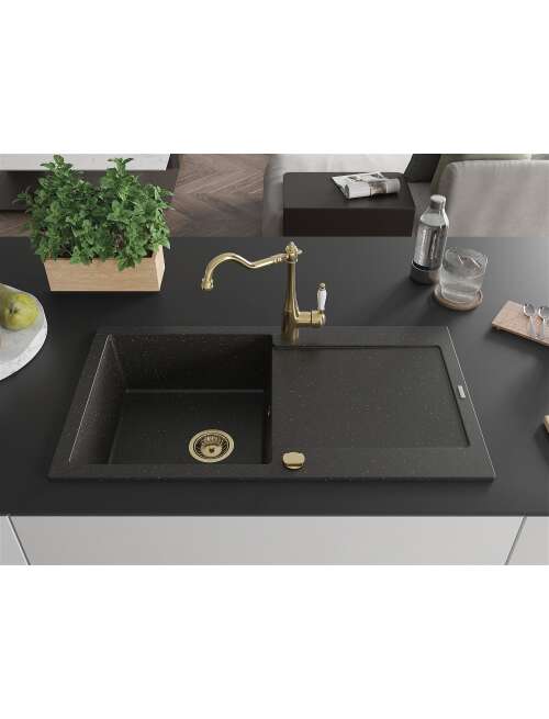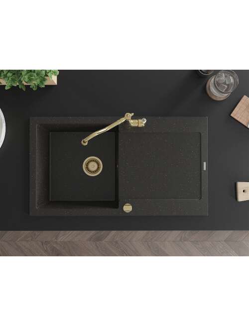 Dane techniczne: Zlewozmywak: Rozmiar: 900x500x190 mm Głębokość komory: 180 mm Wymiary komory: 430x415 mm Średnica odpływu: ø90 mm Typ: 1-komorowy z ociekaczem Rodzaj: Wpuszczany w blat Kolor: Czarny/Złoty metalik Wykończenie syfonu: Złoty Materiał: Granit (80% kruszywo granitowe 20% żywice) Otwór przelewowy: Tak Otwory: ( bateria, automat ) 2 Montaż: Uniwersalny, możliwość montażu z ociekaczem po lewej lub prawej stronie Wysoka odporność na zarysowania i przebarwienia Odporność na szok termiczny Powierzchnia ułatwiająca czyszczenie Dwa dodatkowe podfrezowane otwory do samodzielnego wybicia ø35 Bateria kuchenna: Materiał: Mosiądz Kolor: Złoty Głowica: Ceramiczna Perlator: Tak Typ: Jednouchwytowa Wysokość baterii: 290 mm Zasięg wylewki: 260 mm |