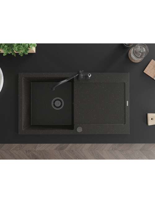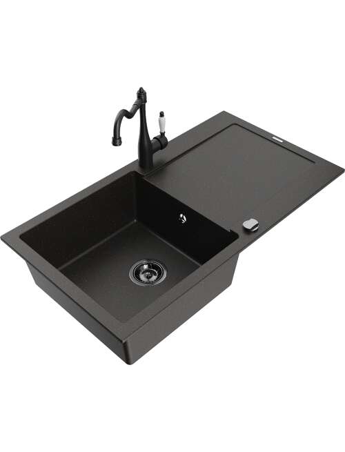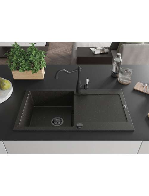 Mexen Leo zlewozmywak granitowy 1-komorowy z ociekaczem i baterią kuchenną Carla, czarny/złoty metalik - 6501-75-670700-70-B