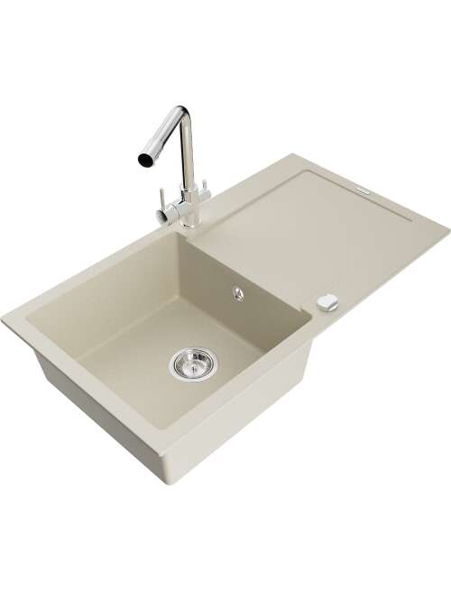 Dane techniczne: Zlewozmywak: Rozmiar: 900x500x190 mm Głębokość komory: 180 mm Wymiary komory: 430x415 mm Średnica odpływu: ø90 mm Typ: 1-komorowy z ociekaczem Rodzaj: Wpuszczany w blat Kolor: Beżowy Wykończenie syfonu: Chrom Materiał: Granit (80% kruszywo granitowe 20% żywice) Otwór przelewowy: Tak Otwory: ( bateria, automat ) 2 Montaż: Uniwersalny, możliwość montażu z ociekaczem po lewej lub prawej stronie Wysoka odporność na zarysowania i przebarwienia Odporność na szok termiczny Powierzchnia ułatwiająca czyszczenie Dwa dodatkowe podfrezowane otwory do samodzielnego wybicia ø35 Bateria kuchenna: Materiał: Mosiądz Kolor: Chrom Głowica: Ceramiczna Perlator: Tak Typ: Dwuuchwytowa Zasięg wylewki: 235 mm Wysokość baterii: 315 mm Bateria dwugłowicowa z dodatkowym filtrem do wody pitnej |