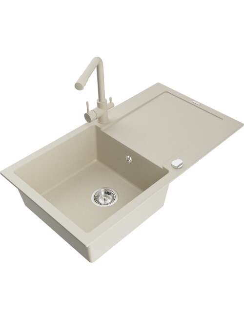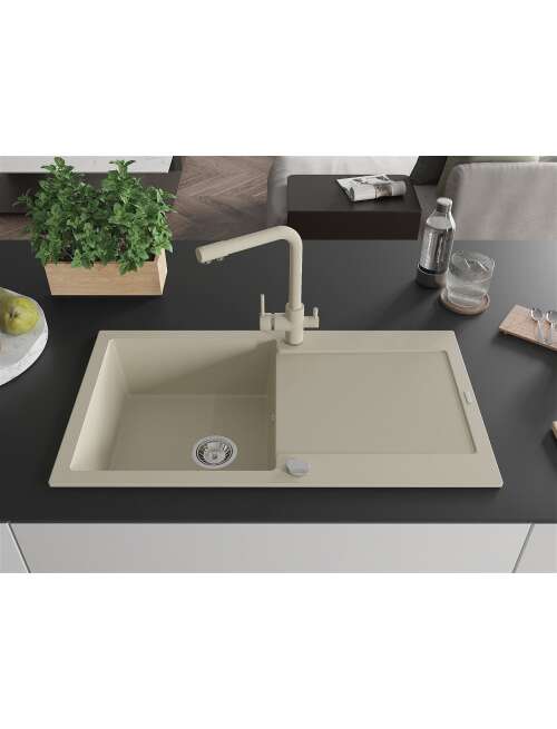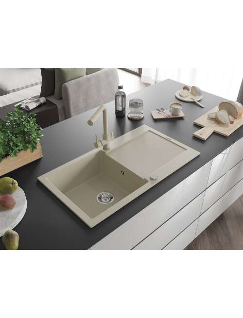 Dane techniczne: Zlewozmywak: Rozmiar: 900x500x190 mm Głębokość komory: 180 mm Wymiary komory: 430x415 mm Średnica odpływu: ø90 mm Typ: 1-komorowy z ociekaczem Rodzaj: Wpuszczany w blat Kolor: Beżowy Wykończenie syfonu: Chrom Materiał: Granit (80% kruszywo granitowe 20% żywice) Otwór przelewowy: Tak Otwory: ( bateria, automat ) 2 Montaż: Uniwersalny, możliwość montażu z ociekaczem po lewej lub prawej stronie Wysoka odporność na zarysowania i przebarwienia Odporność na szok termiczny Powierzchnia ułatwiająca czyszczenie Dwa dodatkowe podfrezowane otwory do samodzielnego wybicia ø35 Bateria kuchenna: Materiał: Mosiądz Kolor: Beżowy Głowica: Ceramiczna Perlator: Tak Typ: Dwuuchwytowa Zasięg wylewki: 235 mm Wysokość baterii: 315 mm Bateria dwugłowicowa z dodatkowym filtrem do wody pitnej |