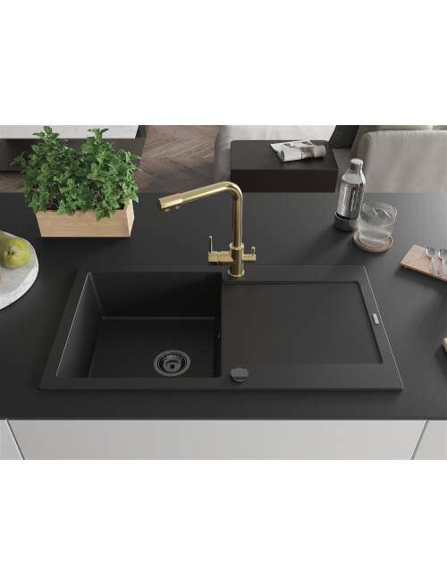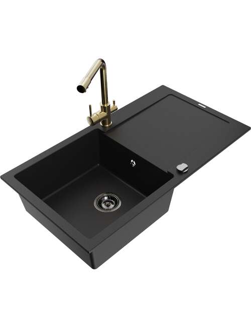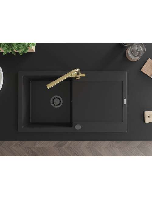 Mexen Leo zlewozmywak granitowy 1-komorowy z ociekaczem i baterią kuchenną Duero, czarny - 6501-77-671600-50-B