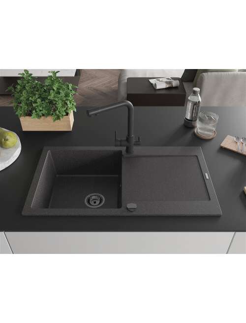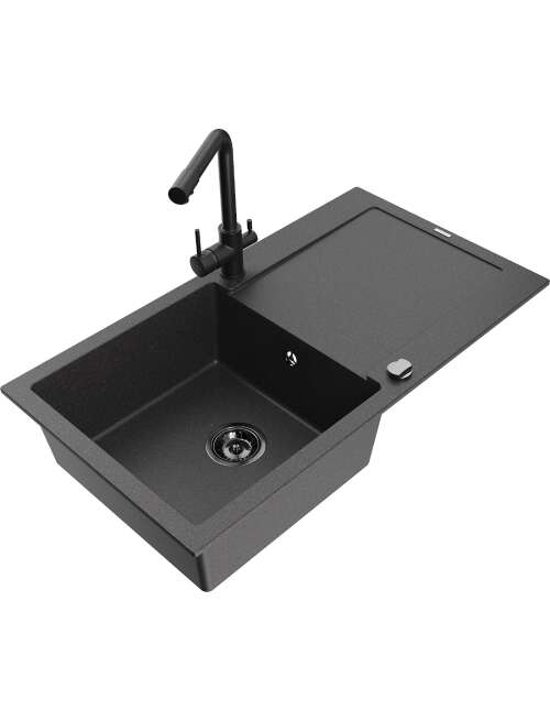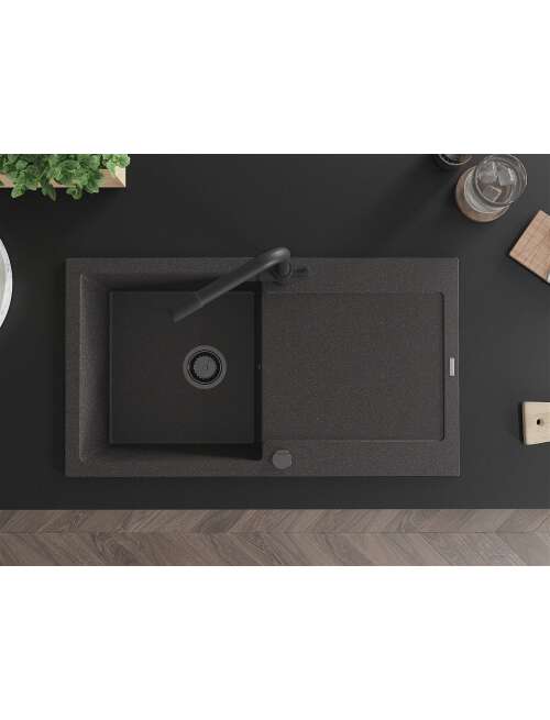Mexen Leo zlewozmywak granitowy 1-komorowy z ociekaczem i baterią kuchenną Duero, czarny nakrapiany - 6501-76-671600-70-B