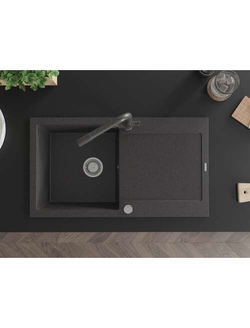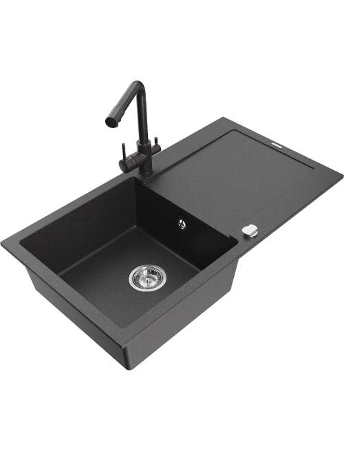 Dane techniczne: Zlewozmywak: Rozmiar: 900x500x190 mm Głębokość komory: 180 mm Wymiary komory: 430x415 mm Średnica odpływu: ø90 mm Typ: 1-komorowy z ociekaczem Rodzaj: Wpuszczany w blat Kolor: Czarny nakrapiany Wykończenie syfonu: Chrom Materiał: Granit (80% kruszywo granitowe 20% żywice) Otwór przelewowy: Tak Otwory: ( bateria, automat ) 2 Montaż: Uniwersalny, możliwość montażu z ociekaczem po lewej lub prawej stronie Wysoka odporność na zarysowania i przebarwienia Odporność na szok termiczny Powierzchnia ułatwiająca czyszczenie Dwa dodatkowe podfrezowane otwory do samodzielnego wybicia ø35 Bateria kuchenna: Materiał: Mosiądz Kolor: Czarny nakrapiany Głowica: Ceramiczna Perlator: Tak Zasięg wylewki: 235 mm Wysokość baterii: 315 mm Typ: Dwuuchwytowa Bateria dwugłowicowa z dodatkowym filtrem do wody pitnej |