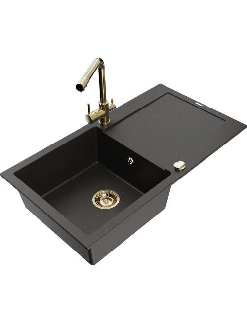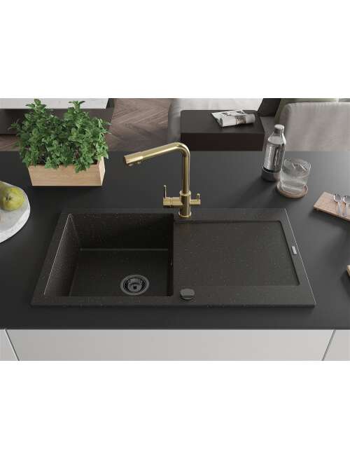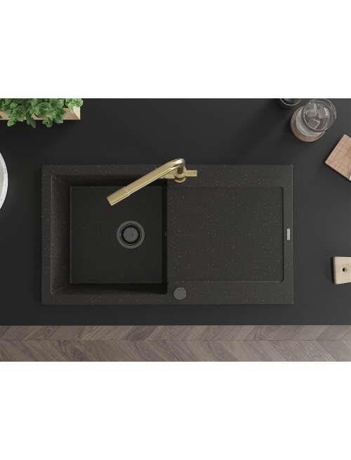 Dane techniczne: Zlewozmywak: Rozmiar: 900x500x190 mm Głębokość komory: 180 mm Wymiary komory: 430x415 mm Średnica odpływu: ø90 mm Typ: 1-komorowy z ociekaczem Rodzaj: Wpuszczany w blat Kolor: Czarny/Złoty metalik Wykończenie syfonu: Czarny Materiał: Granit (80% kruszywo granitowe 20% żywice) Otwór przelewowy: Tak Otwory: ( bateria, automat ) 2 Montaż: Uniwersalny, możliwość montażu z ociekaczem po lewej lub prawej stronie Wysoka odporność na zarysowania i przebarwienia Odporność na szok termiczny Powierzchnia ułatwiająca czyszczenie Dwa dodatkowe podfrezowane otwory do samodzielnego wybicia ø35 Bateria kuchenna: Materiał: Mosiądz Kolor: Złoty Głowica: Ceramiczna Perlator: Tak Zasięg wylewki: 235 mm Wysokość baterii: 315 mm Typ: Dwuuchwytowa Bateria dwugłowicowa z dodatkowym filtrem do wody pitnej |