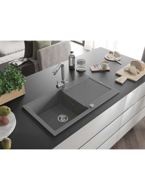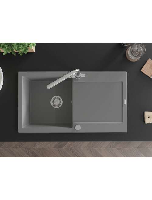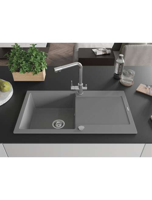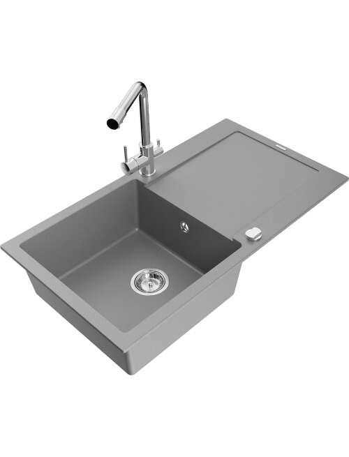 Dane techniczne: Zlewozmywak: Rozmiar: 900x500x190 mm Głębokość komory: 180 mm Wymiary komory: 430x415 mm Średnica odpływu: ø90 mm Typ: 1-komorowy z ociekaczem Rodzaj: Wpuszczany w blat Kolor: Szary Wykończenie syfonu: Chrom Materiał: Granit (80% kruszywo granitowe 20% żywice) Otwór przelewowy: Tak Otwory: ( bateria, automat ) 2 Montaż: Uniwersalny, możliwość montażu z ociekaczem po lewej lub prawej stronie Wysoka odporność na zarysowania i przebarwienia Odporność na szok termiczny Powierzchnia ułatwiająca czyszczenie Dwa dodatkowe podfrezowane otwory do samodzielnego wybicia ø35 Bateria kuchenna: Materiał: Mosiądz Kolor: Chrom Głowica: Ceramiczna Perlator: Tak Typ: Dwuuchwytowa Zasięg wylewki: 235 mm Wysokość baterii: 315 mm Bateria dwugłowicowa z dodatkowym filtrem do wody pitnej |