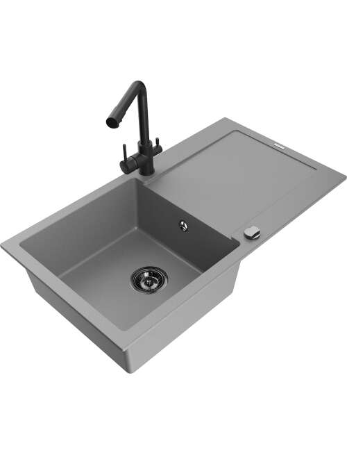 Mexen Leo zlewozmywak granitowy 1-komorowy z ociekaczem i baterią kuchenną Duero, szary - 6501-71-671600-70-B