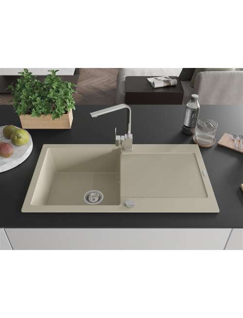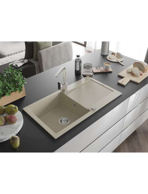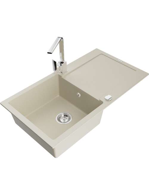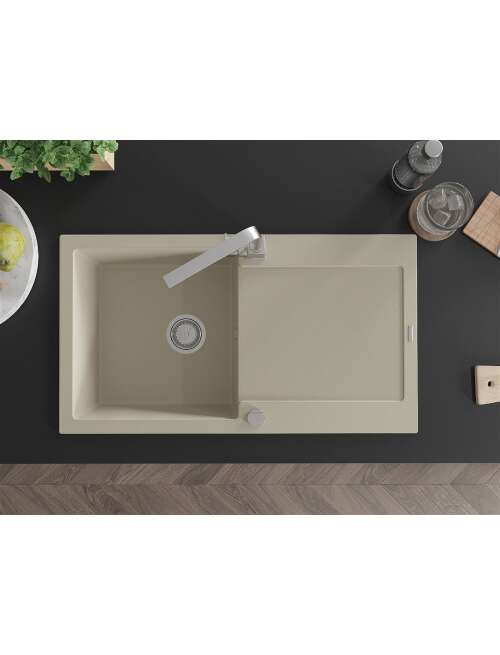 Dane techniczne: Zlewozmywak: Rozmiar: 900x500x190 mm Głębokość komory: 180 mm Wymiary komory: 430x415 mm Średnica odpływu: ø90 mm Typ: 1-komorowy z ociekaczem Rodzaj: Wpuszczany w blat Kolor: Beżowy Wykończenie syfonu: Chrom Materiał: Granit (80% kruszywo granitowe 20% żywice) Otwór przelewowy: Tak Otwory: ( bateria, automat ) 2 Montaż: Uniwersalny, możliwość montażu z ociekaczem po lewej lub prawej stronie Wysoka odporność na zarysowania i przebarwienia Odporność na szok termiczny Powierzchnia ułatwiająca czyszczenie Dwa dodatkowe podfrezowane otwory do samodzielnego wybicia ø35 Bateria kuchenna: Materiał: Mosiądz Kolor: Chrom Głowica: Ceramiczna Perlator: Tak Typ: Jednouchwytowa Wysokość baterii: 290 mm Zasięg wylewki: 220 mm |