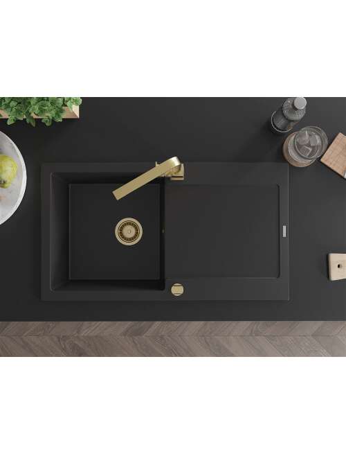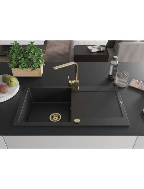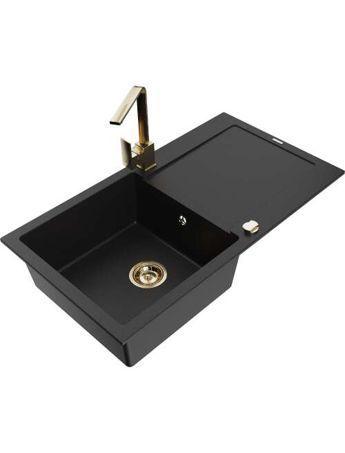 Mexen Leo zlewozmywak granitowy 1-komorowy z ociekaczem i baterią kuchenną Rita, czarny - 6501-77-670300-50