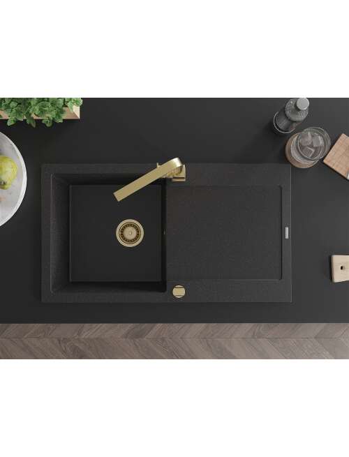 Dane techniczne: Zlewozmywak: Rozmiar: 900x500x190 mm Głębokość komory: 180 mm Wymiary komory: 430x415 mm Średnica odpływu: ø90 mm Typ: 1-komorowy z ociekaczem Rodzaj: Wpuszczany w blat Kolor: Czarny/Srebrny metalik Wykończenie syfonu: Złoty Materiał: Granit (80% kruszywo granitowe 20% żywice) Otwór przelewowy: Tak Otwory: ( bateria, automat ) 2 Montaż: Uniwersalny, możliwość montażu z ociekaczem po lewej lub prawej stronie Wysoka odporność na zarysowania i przebarwienia Odporność na szok termiczny Powierzchnia ułatwiająca czyszczenie Dwa dodatkowe podfrezowane otwory do samodzielnego wybicia ø35 Bateria kuchenna: Materiał: Mosiądz Kolor: Złoty Głowica: Ceramiczna Perlator: Tak Typ: Jednouchwytowa Wysokość baterii: 290 mm Zasięg wylewki: 220 mm |