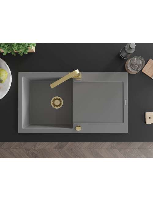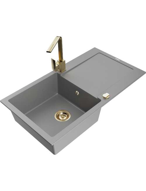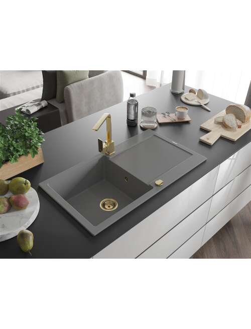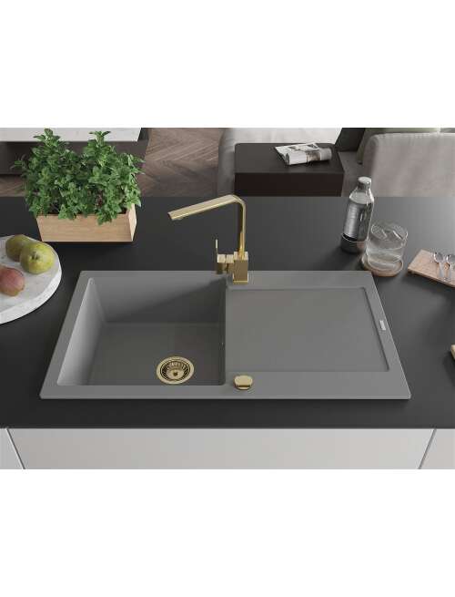 Dane techniczne: Zlewozmywak: Rozmiar: 900x500x190 mm Głębokość komory: 180 mm Wymiary komory: 430x415 mm Średnica odpływu: ø90 mm Typ: 1-komorowy z ociekaczem Rodzaj: Wpuszczany w blat Kolor: Szary Wykończenie syfonu: Złoty Materiał: Granit (80% kruszywo granitowe 20% żywice) Otwór przelewowy: Tak Otwory: ( bateria, automat ) 2 Montaż: Uniwersalny, możliwość montażu z ociekaczem po lewej lub prawej stronie Wysoka odporność na zarysowania i przebarwienia Odporność na szok termiczny Powierzchnia ułatwiająca czyszczenie Dwa dodatkowe podfrezowane otwory do samodzielnego wybicia ø35 Bateria kuchenna: Materiał: Mosiądz Kolor: Złoty Głowica: Ceramiczna Perlator: Tak Typ: Jednouchwytowa Wysokość baterii: 290 mm Zasięg wylewki: 220 mm |