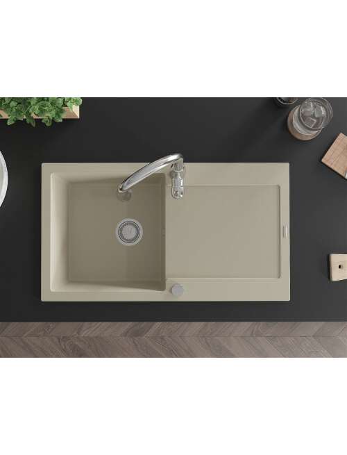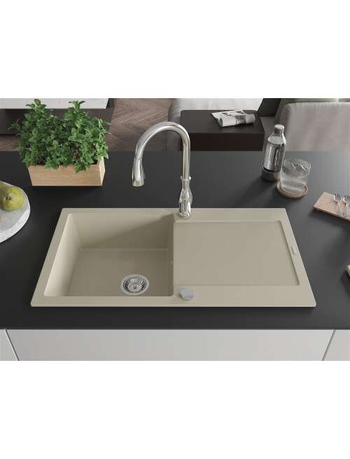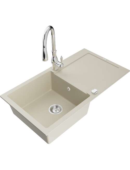 Mexen Leo zlewozmywak granitowy 1-komorowy z ociekaczem i baterią kuchenną Savita, beżowy - 6501-69-672601-00