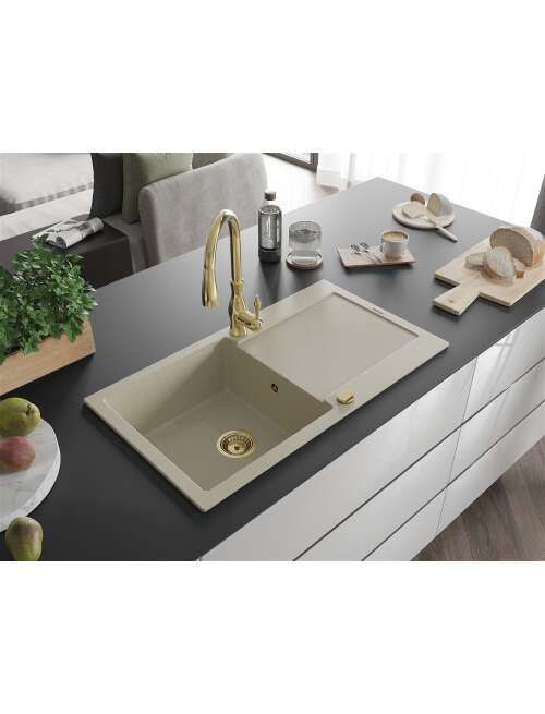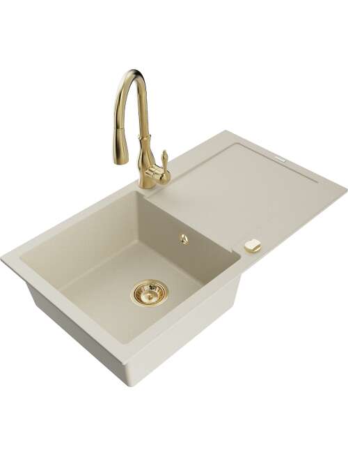 Dane techniczne: Zlewozmywak: Rozmiar: 900x500x190 mm Głębokość komory: 180 mm Wymiary komory: 430x415 mm Średnica odpływu: ø90 mm Typ: 1-komorowy z ociekaczem Rodzaj: Wpuszczany w blat Kolor: Beżowy Wykończenie syfonu: Złoty Materiał: Granit (80% kruszywo granitowe 20% żywice) Otwór przelewowy: Tak Otwory: ( bateria, automat ) 2 Montaż: Uniwersalny, możliwość montażu z ociekaczem po lewej lub prawej stronie Wysoka odporność na zarysowania i przebarwienia Odporność na szok termiczny Powierzchnia ułatwiająca czyszczenie Dwa dodatkowe podfrezowane otwory do samodzielnego wybicia ø35 Bateria kuchenna: Materiał: Mosiądz Kolor: Złoty Głowica: Ceramiczna Perlator: Tak Wysokość baterii: 410 mm Zasięg wylewki: 231 mm |