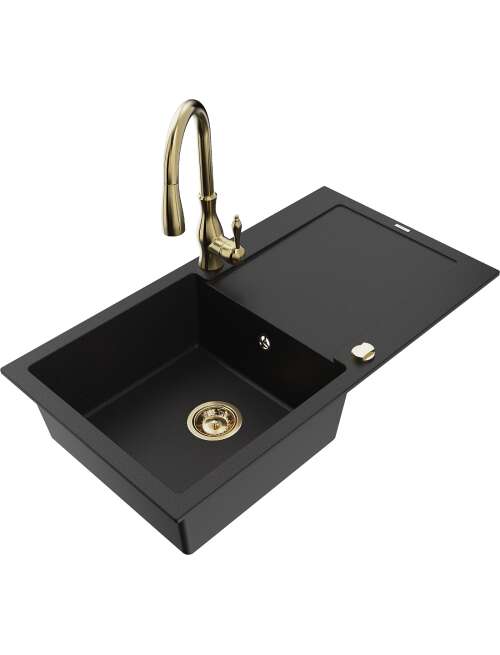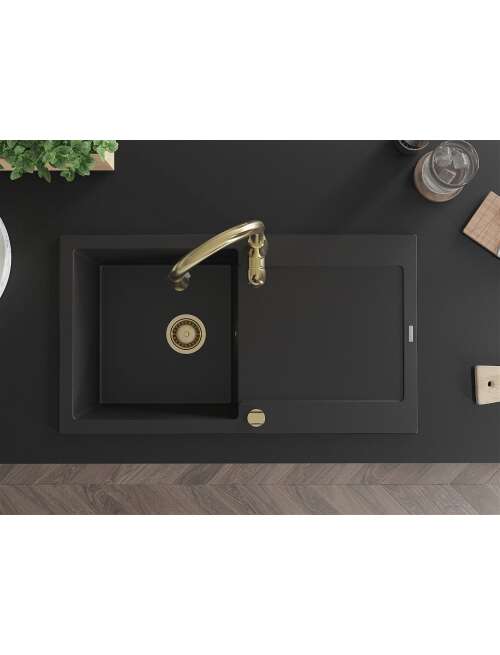Dane techniczne: Zlewozmywak: Rozmiar: 900x500x190 mm Głębokość komory: 180 mm Wymiary komory: 430x415 mm Średnica odpływu: ø90 mm Typ: 1-komorowy z ociekaczem Rodzaj: Wpuszczany w blat Kolor: Czarny Wykończenie syfonu: Złoty Materiał: Granit (80% kruszywo granitowe 20% żywice) Otwór przelewowy: Tak Otwory: ( bateria, automat ) 2 Montaż: Uniwersalny, możliwość montażu z ociekaczem po lewej lub prawej stronie Wysoka odporność na zarysowania i przebarwienia Odporność na szok termiczny Powierzchnia ułatwiająca czyszczenie Dwa dodatkowe podfrezowane otwory do samodzielnego wybicia ø35 Bateria kuchenna: Materiał: Mosiądz Kolor: Złoty Głowica: Ceramiczna Perlator: Tak Wysokość baterii: 410 mm Zasięg wylewki: 231 mm |