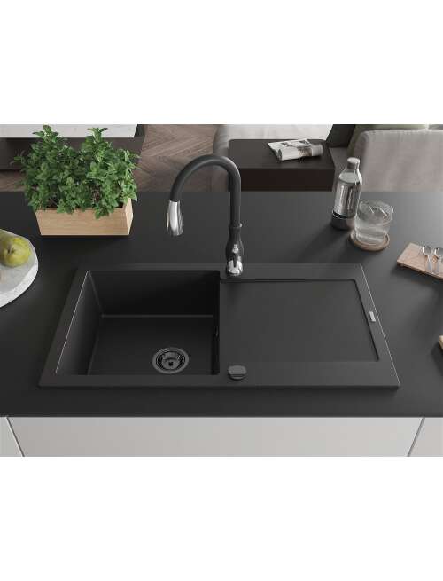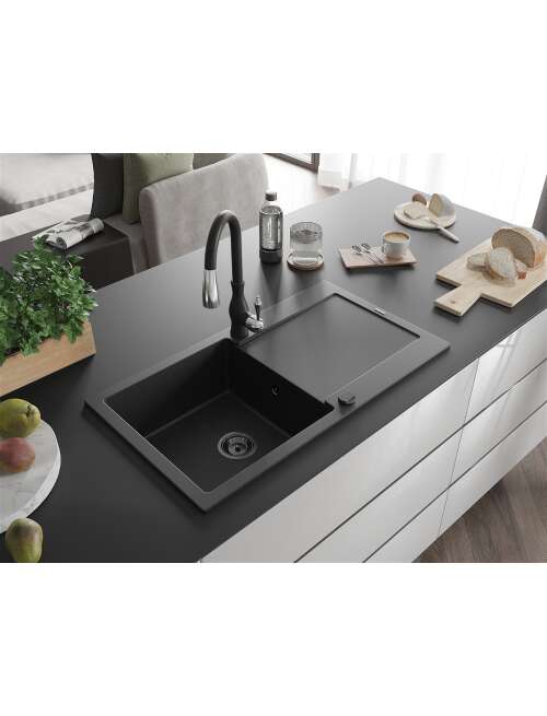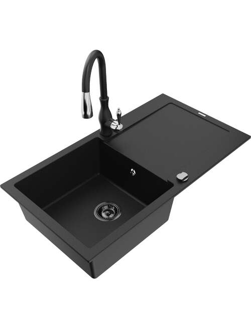 Mexen Leo zlewozmywak granitowy 1-komorowy z ociekaczem i baterią kuchenną Savita, czarny - 6501-77-672601-70-B
