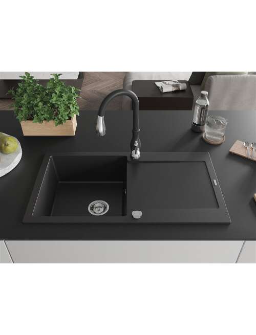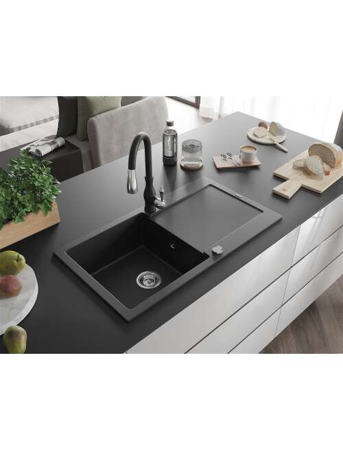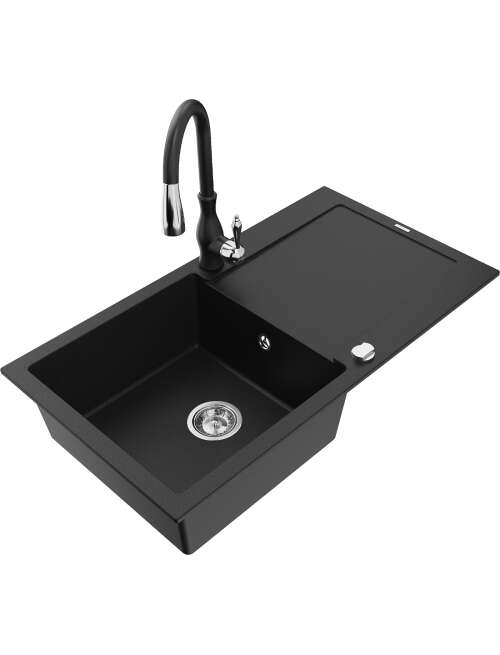 Mexen Leo zlewozmywak granitowy 1-komorowy z ociekaczem i baterią kuchenną Savita, czarny - 6501-77-672601-70