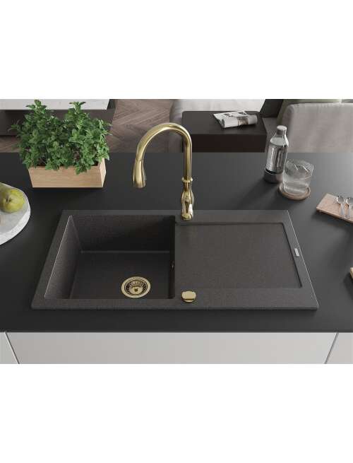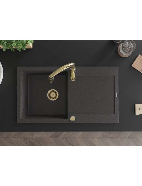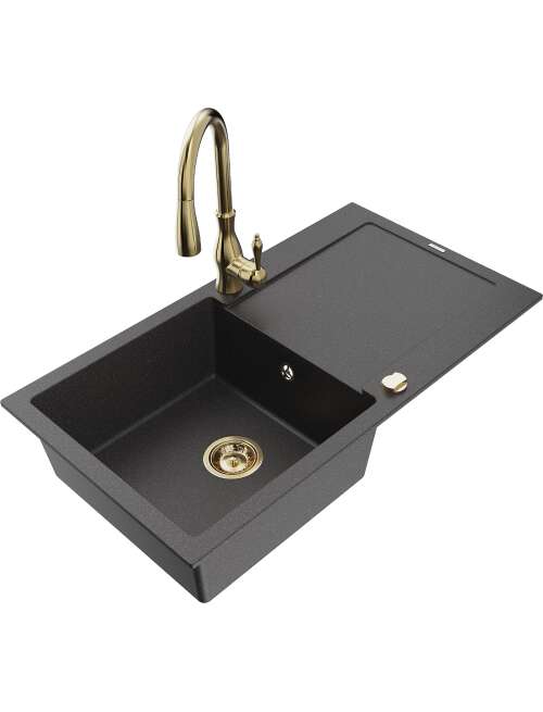 Dane techniczne: Zlewozmywak: Rozmiar: 900x500x190 mm Głębokość komory: 180 mm Wymiary komory: 430x415 mm Średnica odpływu: ø90 mm Typ: 1-komorowy z ociekaczem Rodzaj: Wpuszczany w blat Kolor: Czarny nakrapiany Wykończenie syfonu: Złoty Materiał: Granit (80% kruszywo granitowe 20% żywice) Otwór przelewowy: Tak Otwory: ( bateria, automat ) 2 Montaż: Uniwersalny, możliwość montażu z ociekaczem po lewej lub prawej stronie Wysoka odporność na zarysowania i przebarwienia Odporność na szok termiczny Powierzchnia ułatwiająca czyszczenie Dwa dodatkowe podfrezowane otwory do samodzielnego wybicia ø35 Bateria kuchenna: Materiał: Mosiądz Kolor: Złoty Głowica: Ceramiczna Perlator: Tak Wysokość baterii: 410 mm Zasięg wylewki: 231 mm |