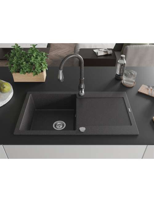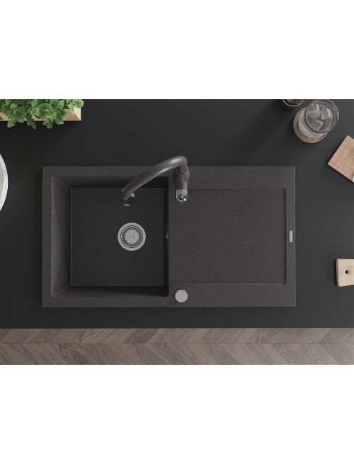 Dane techniczne: Zlewozmywak: Rozmiar: 900x500x190 mm Głębokość komory: 180 mm Wymiary komory: 430x415 mm Średnica odpływu: ø90 mm Typ: 1-komorowy z ociekaczem Rodzaj: Wpuszczany w blat Kolor: Czarny nakrapiany Wykończenie syfonu: Chrom Materiał: Granit (80% kruszywo granitowe 20% żywice) Otwór przelewowy: Tak Otwory: ( bateria, automat ) 2 Montaż: Uniwersalny, możliwość montażu z ociekaczem po lewej lub prawej stronie Wysoka odporność na zarysowania i przebarwienia Odporność na szok termiczny Powierzchnia ułatwiająca czyszczenie Dwa dodatkowe podfrezowane otwory do samodzielnego wybicia ø35 Bateria kuchenna: Materiał: Mosiądz Kolor: Czarny nakrapiany Głowica: Ceramiczna Perlator: Tak Wysokość baterii: 410 mm Zasięg wylewki: 231 mm |