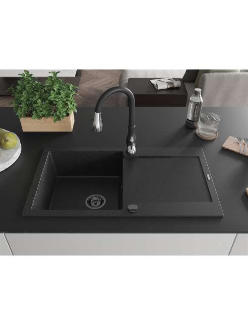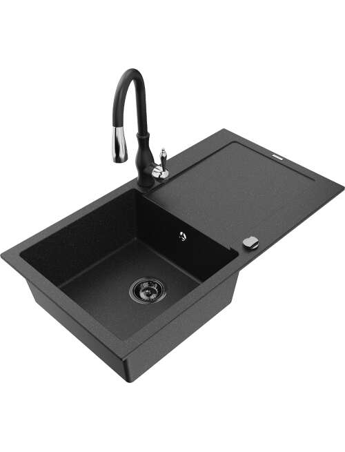 Dane techniczne: Zlewozmywak: Rozmiar: 900x500x190 mm Głębokość komory: 180 mm Wymiary komory: 430x415 mm Średnica odpływu: ø90 mm Typ: 1-komorowy z ociekaczem Rodzaj: Wpuszczany w blat Kolor: Czarny/srebrny metalik Wykończenie syfonu: Czarny Materiał: Granit (80% kruszywo granitowe 20% żywice) Otwór przelewowy: Tak Otwory: ( bateria, automat ) 2 Montaż: Uniwersalny, możliwość montażu z ociekaczem po lewej lub prawej stronie Wysoka odporność na zarysowania i przebarwienia Odporność na szok termiczny Powierzchnia ułatwiająca czyszczenie Dwa dodatkowe podfrezowane otwory do samodzielnego wybicia ø35 Bateria kuchenna: Materiał: Mosiądz Kolor: Czarny Głowica: Ceramiczna Perlator: Tak Wysokość baterii: 410 mm Zasięg wylewki: 231 mm |