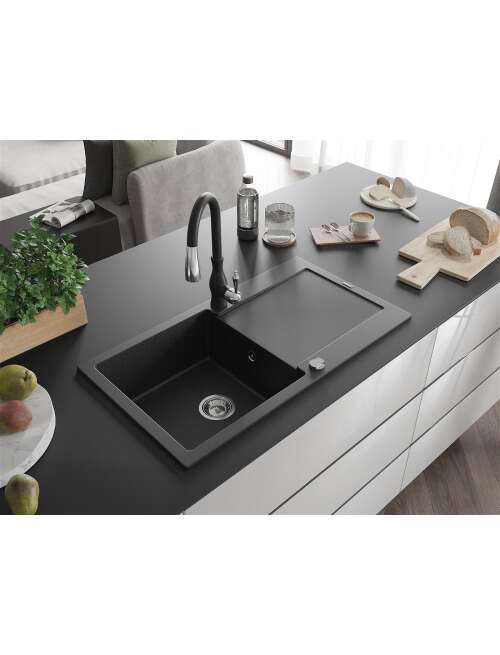 Mexen Leo zlewozmywak granitowy 1-komorowy z ociekaczem i baterią kuchenną Savita, czarny/srebrny metalik - 6501-73-672601-70