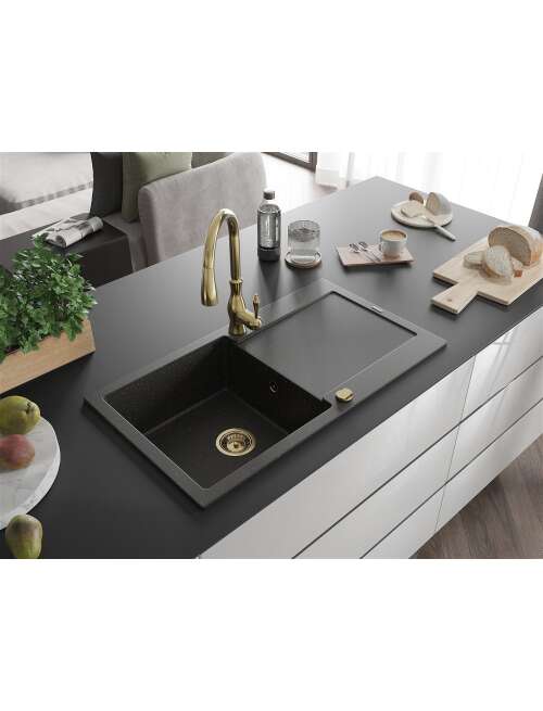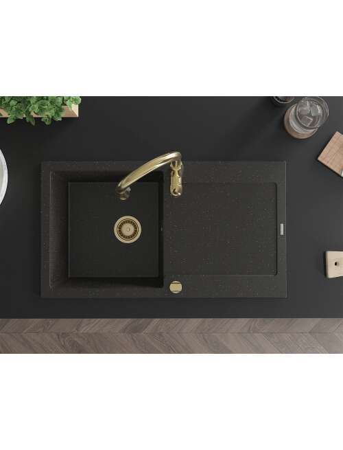Mexen Leo zlewozmywak granitowy 1-komorowy z ociekaczem i baterią kuchenną Savita, czarny/złoty metalik - 6501-75-672601-50