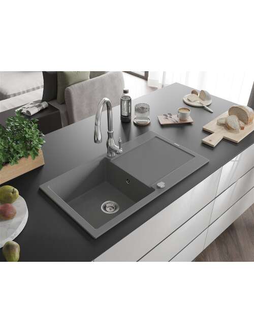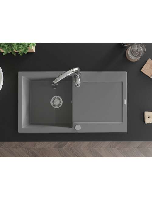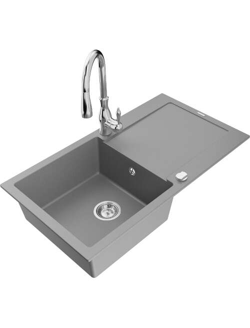 Mexen Leo zlewozmywak granitowy 1-komorowy z ociekaczem i baterią kuchenną Savita, szary - 6501-71-672601-00