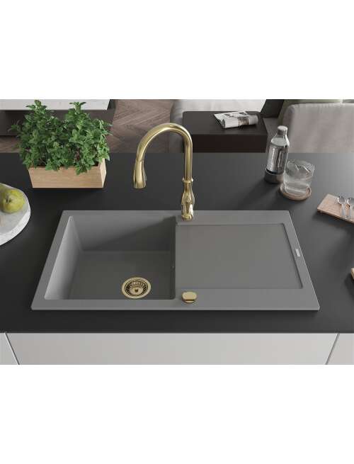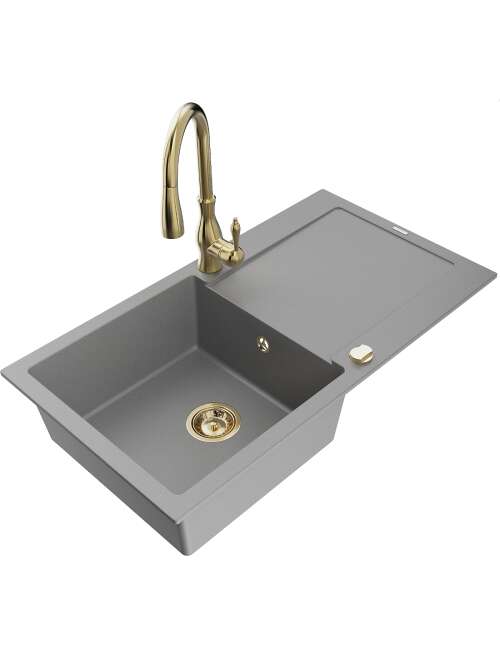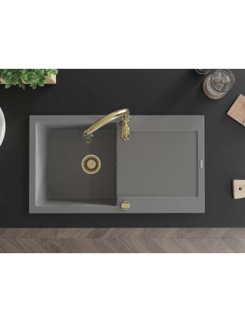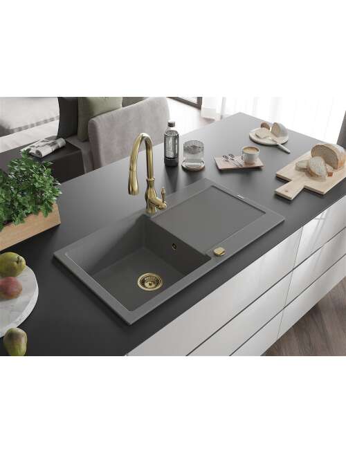Dane techniczne: Zlewozmywak: Rozmiar: 900x500x190 mm Głębokość komory: 180 mm Wymiary komory: 430x415 mm Średnica odpływu: ø90 mm Typ: 1-komorowy z ociekaczem Rodzaj: Wpuszczany w blat Kolor: Szary Wykończenie syfonu: Złoty Materiał: Granit (80% kruszywo granitowe 20% żywice) Otwór przelewowy: Tak Otwory: ( bateria, automat ) 2 Montaż: Uniwersalny, możliwość montażu z ociekaczem po lewej lub prawej stronie Wysoka odporność na zarysowania i przebarwienia Odporność na szok termiczny Powierzchnia ułatwiająca czyszczenie Dwa dodatkowe podfrezowane otwory do samodzielnego wybicia ø35 Bateria kuchenna: Materiał: Mosiądz Kolor: Złoty Głowica: Ceramiczna Perlator: Tak Wysokość baterii: 410 mm Zasięg wylewki: 231 mm |