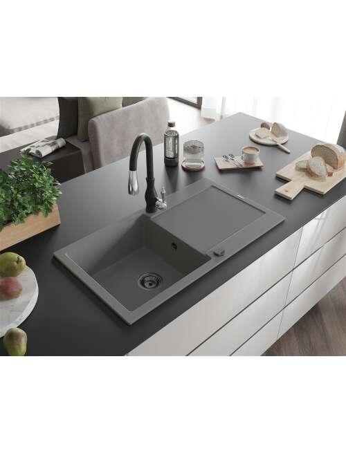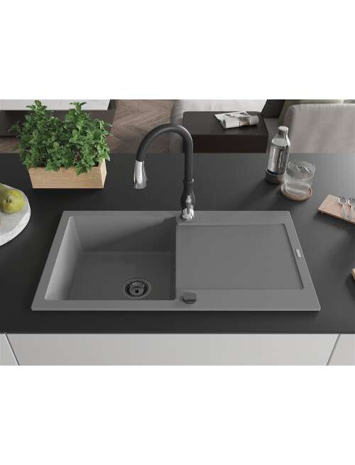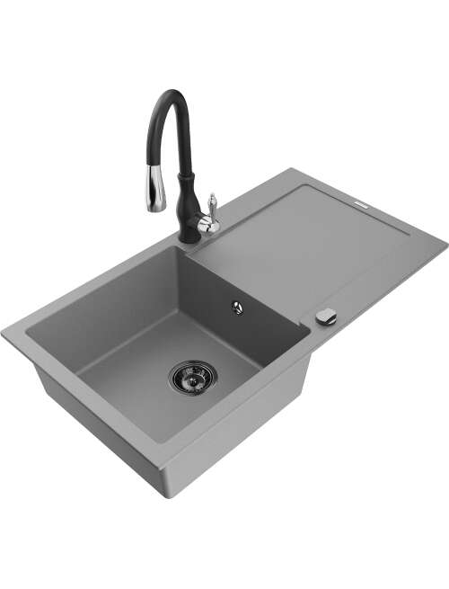 Mexen Leo zlewozmywak granitowy 1-komorowy z ociekaczem i baterią kuchenną Savita, szary - 6501-71-672601-70-B