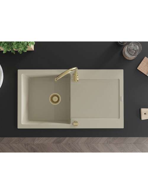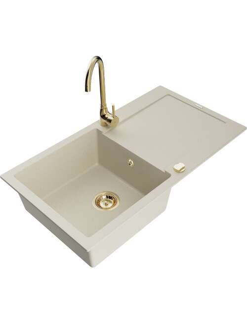 Mexen Leo zlewozmywak granitowy 1-komorowy z ociekaczem i baterią kuchenną Telma, beżowy - 6501-69-670200-50