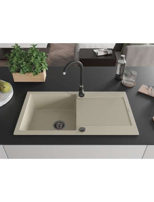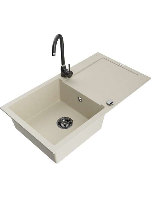 Dane techniczne: Zlewozmywak: Rozmiar: 900x500x190 mm Głębokość komory: 180 mm Wymiary komory: 430x415 mm Średnica odpływu: ø90 mm Typ: 1-komorowy z ociekaczem Rodzaj: Wpuszczany w blat Kolor: Beżowy Wykończenie syfonu: Czarny Materiał: Granit (80% kruszywo granitowe 20% żywice) Otwór przelewowy: Tak Otwory: ( bateria, automat ) 2 Montaż: Uniwersalny, możliwość montażu z ociekaczem po lewej lub prawej stronie Wysoka odporność na zarysowania i przebarwienia Odporność na szok termiczny Powierzchnia ułatwiająca czyszczenie Dwa dodatkowe podfrezowane otwory do samodzielnego wybicia ø35 Bateria kuchenna: Materiał: Mosiądz Kolor: Czarny Głowica: Ceramiczna Perlator: Tak Typ: Jednouchwytowa Wysokość baterii: 335 mm Zasięg wylewki: 180 mm |