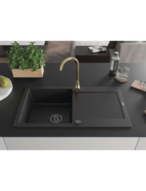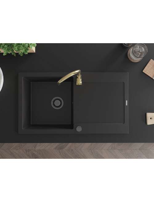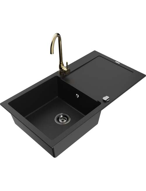 Mexen Leo zlewozmywak granitowy 1-komorowy z ociekaczem i baterią kuchenną Telma, czarny - 6501-77-670200-50-B