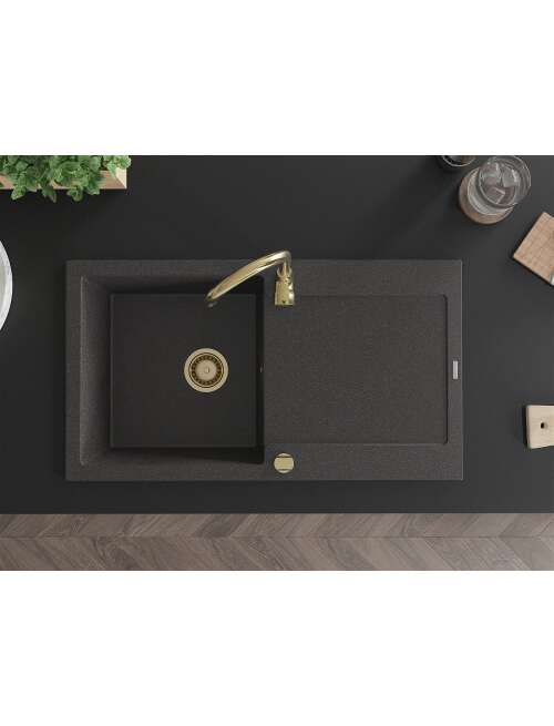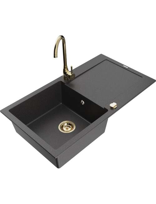 Dane techniczne: Zlewozmywak: Rozmiar: 900x500x190 mm Głębokość komory: 180 mm Wymiary komory: 430x415 mm Średnica odpływu: ø90 mm Typ: 1-komorowy z ociekaczem Rodzaj: Wpuszczany w blat Kolor: Czarny nakrapiamy Wykończenie syfonu: Złoty Materiał: Granit (80% kruszywo granitowe 20% żywice) Otwór przelewowy: Tak Otwory: ( bateria, automat ) 2 Montaż: Uniwersalny, możliwość montażu z ociekaczem po lewej lub prawej stronie Wysoka odporność na zarysowania i przebarwienia Odporność na szok termiczny Powierzchnia ułatwiająca czyszczenie Dwa dodatkowe podfrezowane otwory do samodzielnego wybicia ø35 Bateria kuchenna: Materiał: Mosiądz Kolor: Złoty Głowica: Ceramiczna Perlator: Tak Typ: Jednouchwytowa Wysokość baterii: 335 mm Zasięg wylewki: 180 mm |
