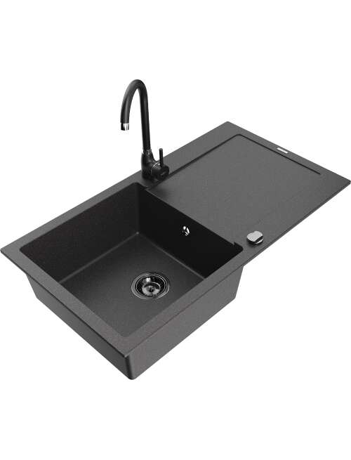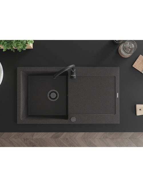 Mexen Leo zlewozmywak granitowy 1-komorowy z ociekaczem i baterią kuchenną Telma, czarny nakrapiany - 6501-76-670200-70-B
