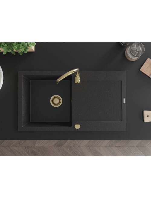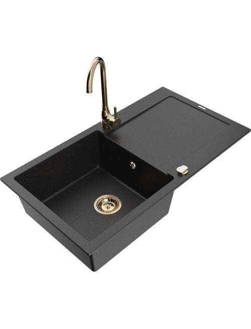 Mexen Leo zlewozmywak granitowy 1-komorowy z ociekaczem i baterią kuchenną Telma, czarny/srebrny metalik - 6501-73-670200-50