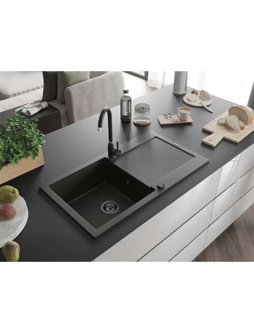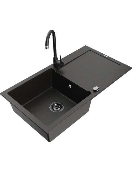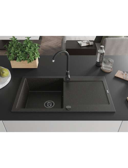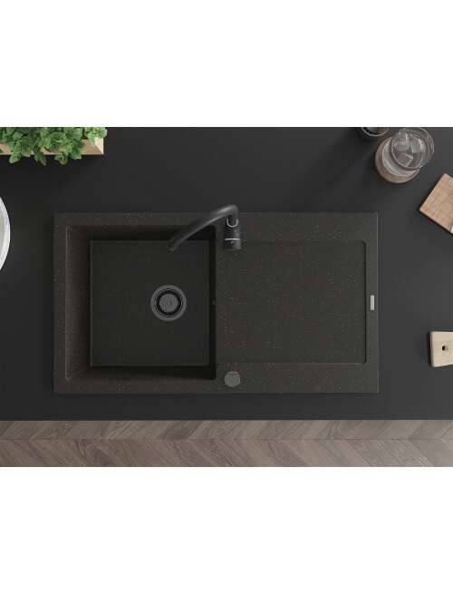 Dane techniczne: Zlewozmywak: Rozmiar: 900x500x190 mm Głębokość komory: 180 mm Wymiary komory: 430x415 mm Średnica odpływu: ø90 mm Typ: 1-komorowy z ociekaczem Rodzaj: Wpuszczany w blat Kolor: Czarny/Złoty metalik Wykończenie syfonu: Czarny Materiał: Granit (80% kruszywo granitowe 20% żywice) Otwór przelewowy: Tak Otwory: ( bateria, automat ) 2 Montaż: Uniwersalny, możliwość montażu z ociekaczem po lewej lub prawej stronie Wysoka odporność na zarysowania i przebarwienia Odporność na szok termiczny Powierzchnia ułatwiająca czyszczenie Dwa dodatkowe podfrezowane otwory do samodzielnego wybicia ø35 Bateria kuchenna: Materiał: Mosiądz Kolor: Czarny Głowica: Ceramiczna Perlator: Tak Typ: Jednouchwytowa Wysokość baterii: 335 mm Zasięg wylewki: 180 mm |