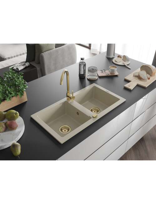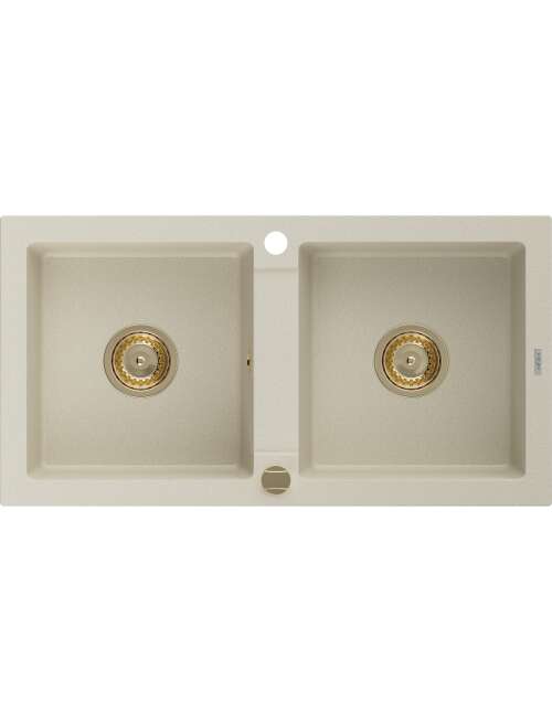 Dane techniczne: Rozmiar: 820x436x161 mm Głębokość komory: 151 mm Wymiary komory: 356x336 mm Średnica odpływu: ø90 mm Rodzaj: 2-komorowy Typ: Wpuszczany w blat Materiał: Granit Kolor: Beżowy Wykończenie syfonu: Złoty Otwór przelewowy: Tak Otwór na baterie: Tak Syfon automatyczny w komplecie Wysoka odporność na zarysowania i przebarwienia Odporność na szok termiczny Powierzchnia ułatwiająca czyszczenie |