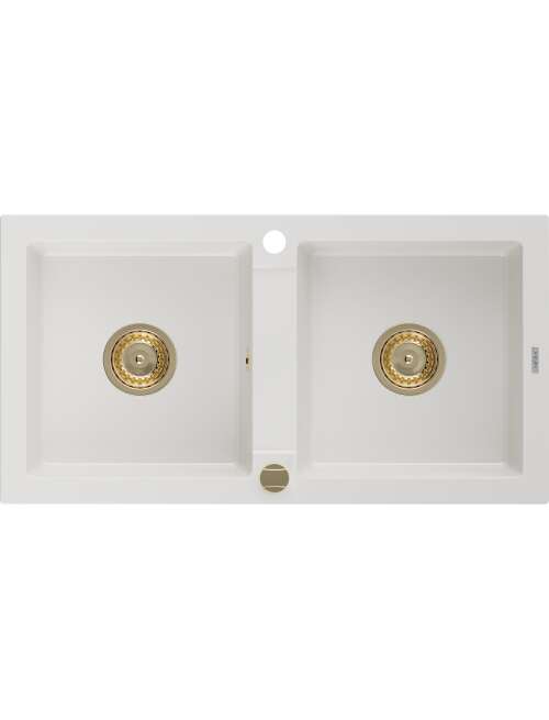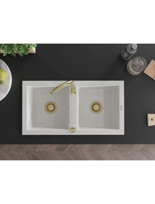 Mexen Mario zlewozmywak granitowy 2-komorowy 820 x 436 mm, biały, syfon złoty - 6504822000-20-G
