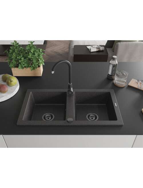Dane techniczne: Rozmiar: 820x436x161 mm Głębokość komory: 151 mm Wymiary komory: 356x336 mm Średnica odpływu: ø90 mm Rodzaj: 2-komorowy Typ: Wpuszczany w blat Materiał: Granit Kolor: Czarny nakrapiany Wykończenie syfonu: Czarny Otwór przelewowy: Tak Otwór na baterie: Tak Syfon automatyczny w komplecie Wysoka odporność na zarysowania i przebarwienia Odporność na szok termiczny Powierzchnia ułatwiająca czyszczenie |