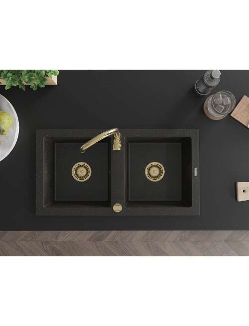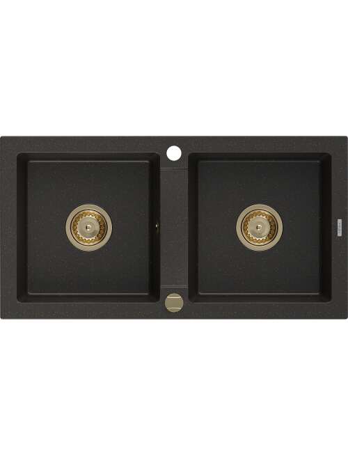 Dane techniczne: Rozmiar: 820x436x161 mm Głębokość komory: 151 mm Wymiary komory: 356x336 mm Średnica odpływu: ø90 mm Rodzaj: 2-komorowy Typ: Wpuszczany w blat Materiał: Granit Kolor: Czarny/Złoty metalik Wykończenie syfonu: Złoty Otwór przelewowy: Tak Otwór na baterie: Tak Syfon automatyczny w komplecie Wysoka odporność na zarysowania i przebarwienia Odporność na szok termiczny Powierzchnia ułatwiająca czyszczenie |