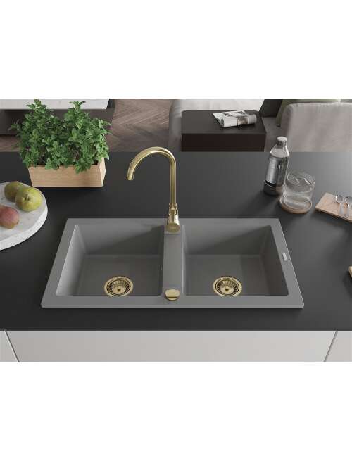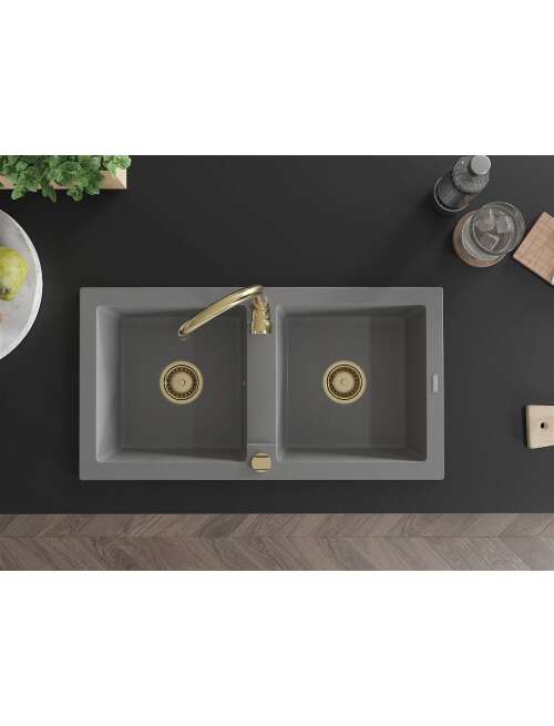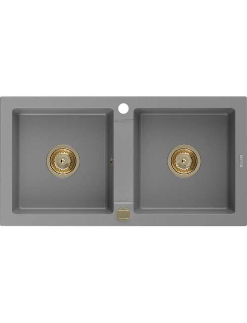 Dane techniczne: Rozmiar: 820x436x161 mm Głębokość komory: 151 mm Wymiary komory: 356x336 mm Średnica odpływu: ø90 mm Rodzaj: 2-komorowy Typ: Wpuszczany w blat Materiał: Granit Kolor: Szary Wykończenie syfonu: Złoty Otwór przelewowy: Tak Otwór na baterie: Tak Syfon automatyczny w komplecie Wysoka odporność na zarysowania i przebarwienia Odporność na szok termiczny Powierzchnia ułatwiająca czyszczenie |